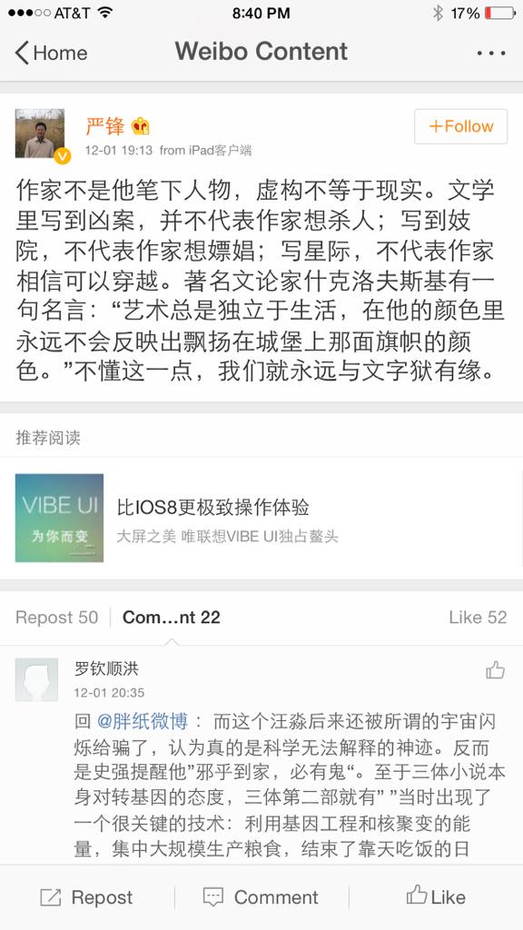 方舟子 @fangshimin · Dec 4复旦严锋教授又迫不及待地来证明自己的阅读能力和智力了。刘慈欣都理直气壮地承认随意乱写了他还来洗地。刘慈欣的问题不是好比直男写了同志小说,而是好比一个作家自称支持同性恋权益却写了一部妖魔化同性恋的小说。连比方都打不好,那肯定是智力问题。 https://pbs.twimg.com/media/B3_-5SeCIAAPuqt.jpg:large
