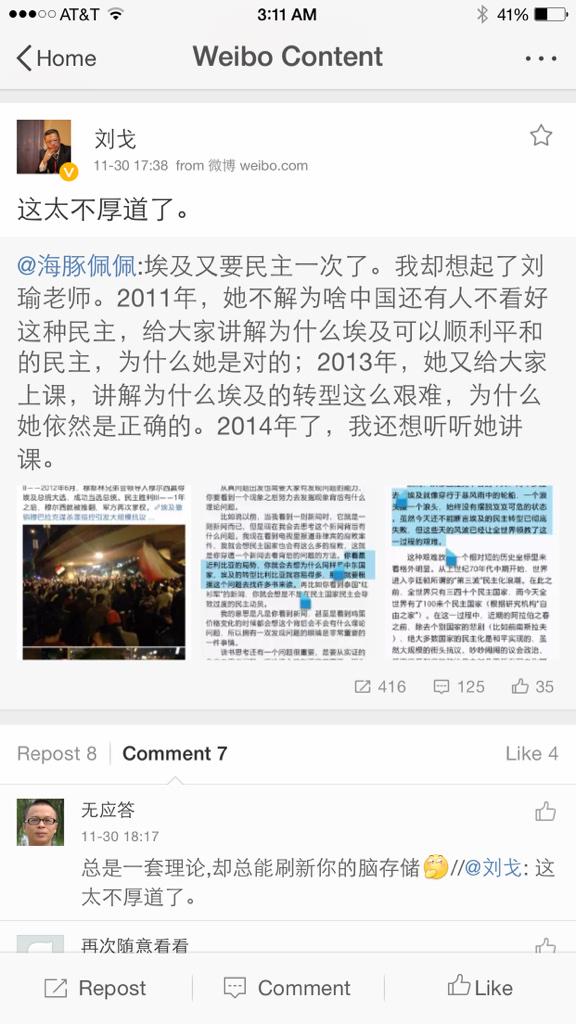 为书一生 ?@weishuyisheng Dec 3@intronintron 大刘不是同情反转人士,是故意的,被方先生批评后恼羞成怒,一改平日谦谦子君子的做派。