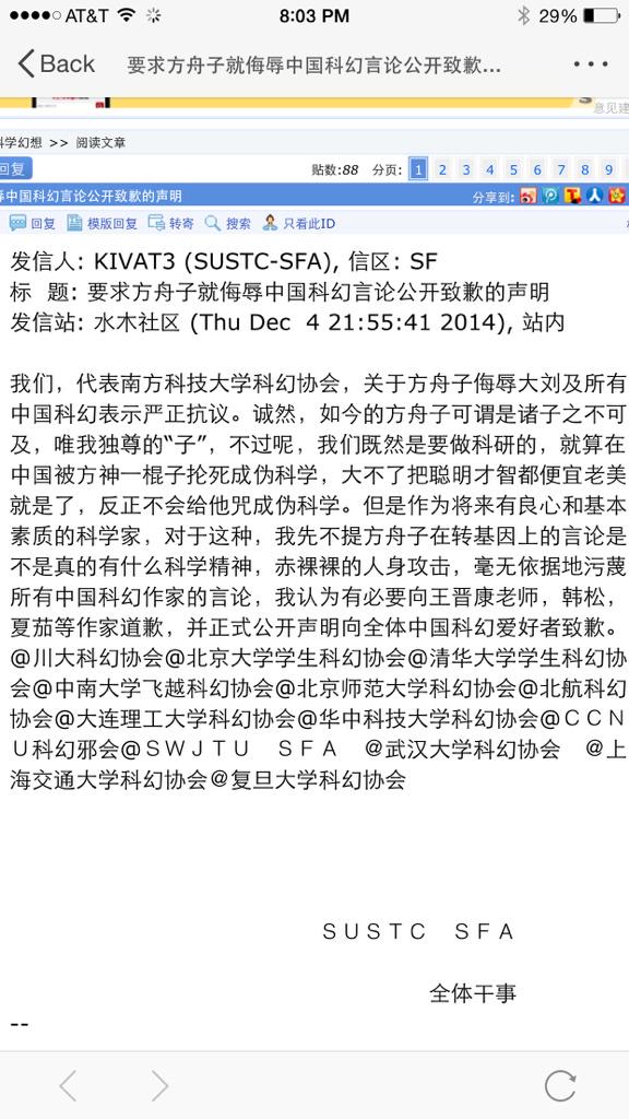 方舟子 @fangshimin · Dec 3刘慈欣虽然气急败坏、骂骂咧咧,毕竟还是承认自己当时写得随意“引起误解”,这不是在打复旦严锋、科幻宝树等替他拼命洗地的粉丝的脸吗?严锋、宝树居然还有脸凑上去宣布胜利,有阅读障碍的人真是幸福。
