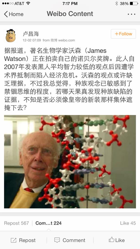 方舟子 @fangshimin · Dec 5别指望哪天能发现种族基因缺陷的证据为种族主义言论洗地,因为种族是个文化概念,不是生物学概念,种族不具有遗传学意义,当然也就不存在种族基因。比如说,所谓的“黑人”是由许多多样性很大的遗传群体组成的,不存在一个“黑人”遗传群体。 https://pbs.twimg.com/media/B4Jb71RCEAATwH5.jpg:large