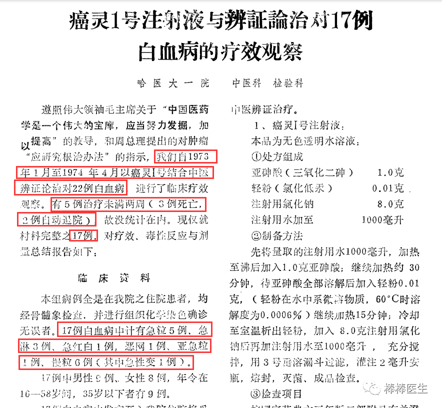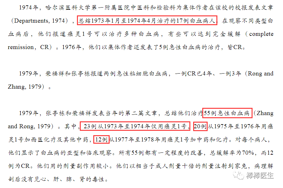 这篇文章中详细写了一名1974年4月的病人董某芝的治疗过程,该病人1974年4月18日因妊娠6个月伴发热和多处出血住院,入院后诊断为急性粒细胞白血病,开始用中药+癌灵一号及其他西药抗生素、激素和止血药等治疗。4月28日自然分娩,胎儿死亡,继之以高热和阴道出血,继续中药+癌灵一号,西药抗生素加至三联(青霉素+链霉素+红霉素)。5月7日复查血象白细胞仍然高达10万/立方毫米(正常不超过1万),5月8日开始加上西药化疗6-MP(6巯基嘌呤)连续3天。5月25日白细胞即降到2千。就这个过程,能说是单用癌灵一号吗?能把疗效全算在癌灵一号上吗?别说6MP不服,中药也不服啊。
