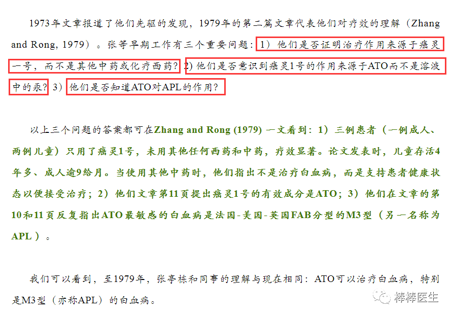 饶毅还认为,张亭栋1979年的论文回答了3个问题:1)他们是否证明治疗作用来源于癌灵一号,而不是其他中药或化疗西药?2) 他们是否意识到癌灵1号的作用来源于ATO而不是溶液中的汞?3)他们是否知道ATO对APL的作用?(截图)