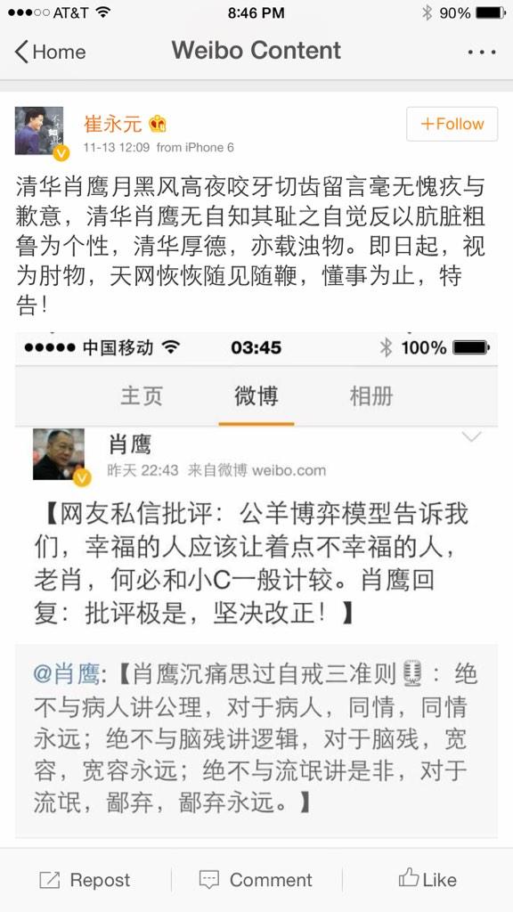 方舟子 @fangshimin · Nov 14崔永元曾经号称司马南不道歉就“一日一夹头”,坚持夹了几天就悄悄消停了。现在又号称要对肖鹰“随见随鞭,懂事为止”,就像司马南不会道歉,肖鹰也不会“懂事”,这回崔永元能坚持“鞭”几天? https://pbs.twimg.com/media/B2YorjnCAAEt5o5.jpg:large