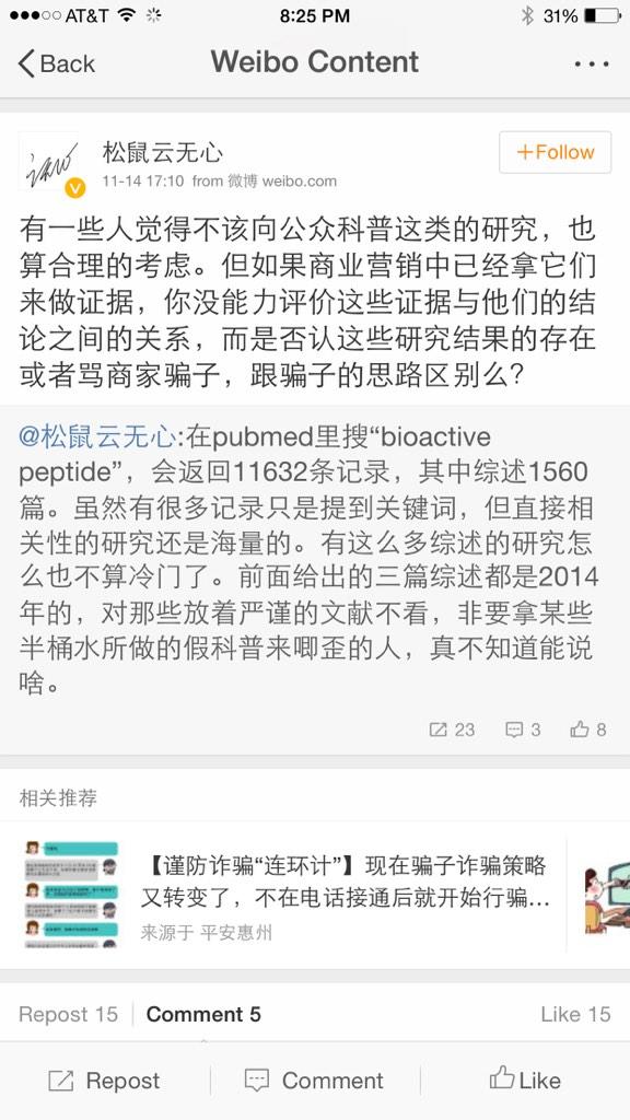 方舟子 @fangshimin · Nov 15泡泡博士云无心说,从猪脾之类的材料提取一堆多肽出来,就叫bioactive peptide,有无数文献支持呢,好像那些文献都在提猪脾似的。他这不只是半桶水爱冒泡泡,而且是习惯性为骗子洗地。 https://pbs.twimg.com/media/B2dLO1JIAAErgYU.jpg:large
