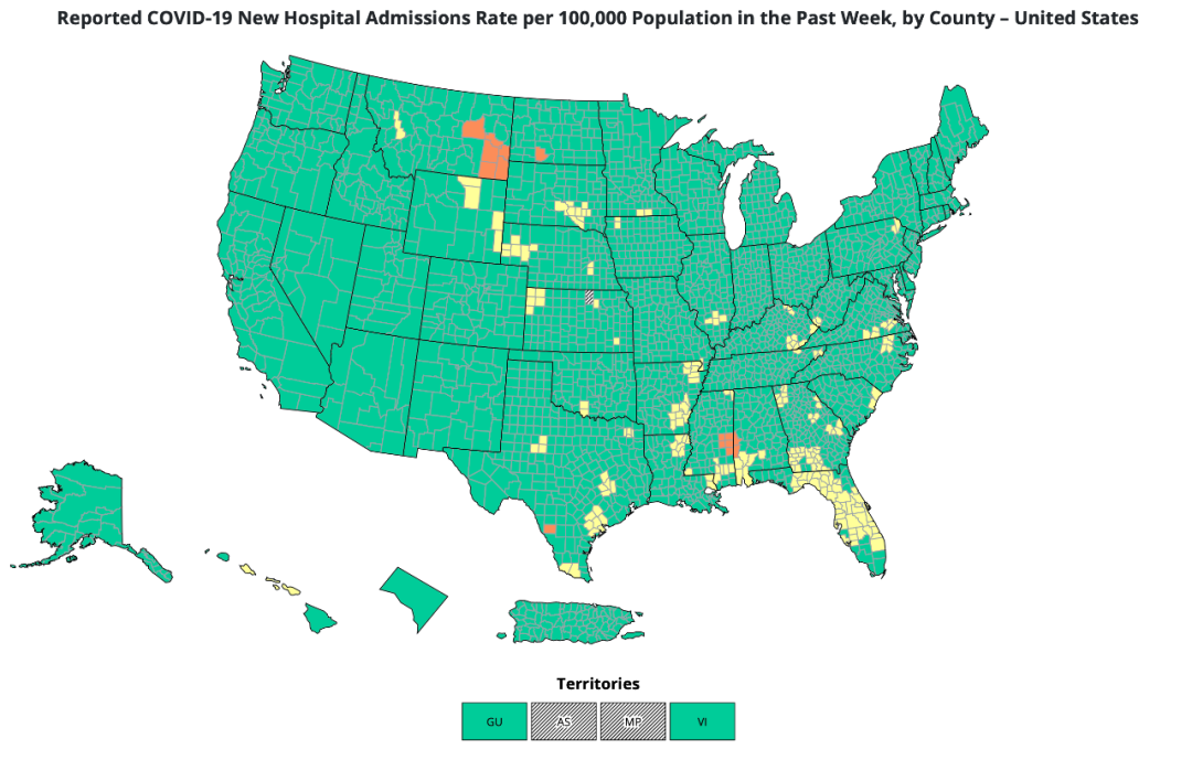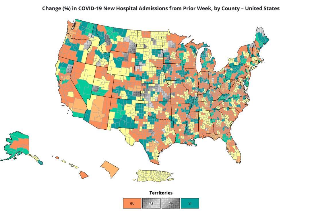 最有说服力的当然是看权威机构的统计数据。喜欢宣扬新冠恐慌的人最近喜欢用增加率来说事,比如这个月比上个月又增加了多少,而绝口不提绝对值。看一下CDC的统计就知道了,比如下面这两张图,图片中颜色越偏红就说明情况越坏,越偏蓝情况就越好。如果只看增长率似乎很严重,但看总数和绝对值就会发现绝大多数地区,不管是普通病房还是ICU病房新冠病人数量都处于大流行以来的低位。