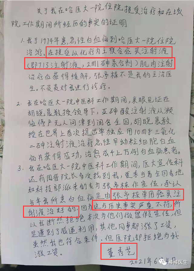 董姓病人至今尚健在,堪称世界上无病生存最长的APL病人,是见证哈医大ATO治疗APL历史的活化石。在1990年代末,哈医一院中医科特招聘她为科室护工。就在去年,面对哈医大的调查,已退休多年的她曾经写过一个证词(如图)。