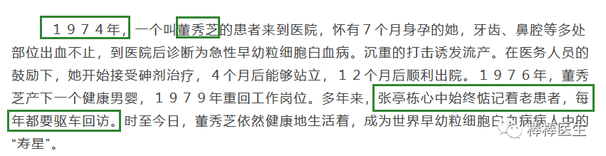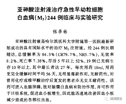 但张亭栋为什么突然冒出这么个结论呢?是因为那一例可能为APL的董姓病人,在1978年已经存活4年了,是当时存活最长的。仅此一例个案其实也说明不了有效,但确实是一个启发。可惜的是,这个启发实际上被张亭栋埋没了,因为他在后来的十年中并没有开始单用癌灵一号治疗APL,也没有取得过对APL最有效的结果;他大量使用的是AOAP方案治疗所有的急非淋白血病,疗效远不如单纯的化疗(详见商榷2)。