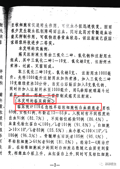3、关于临床应用案例,说明材料中引用的110例早幼粒细胞白血病的临床资料完全来自于胡晓晨的文章《713注射液治疗急性早幼粒细胞白血病110例临床观察》。