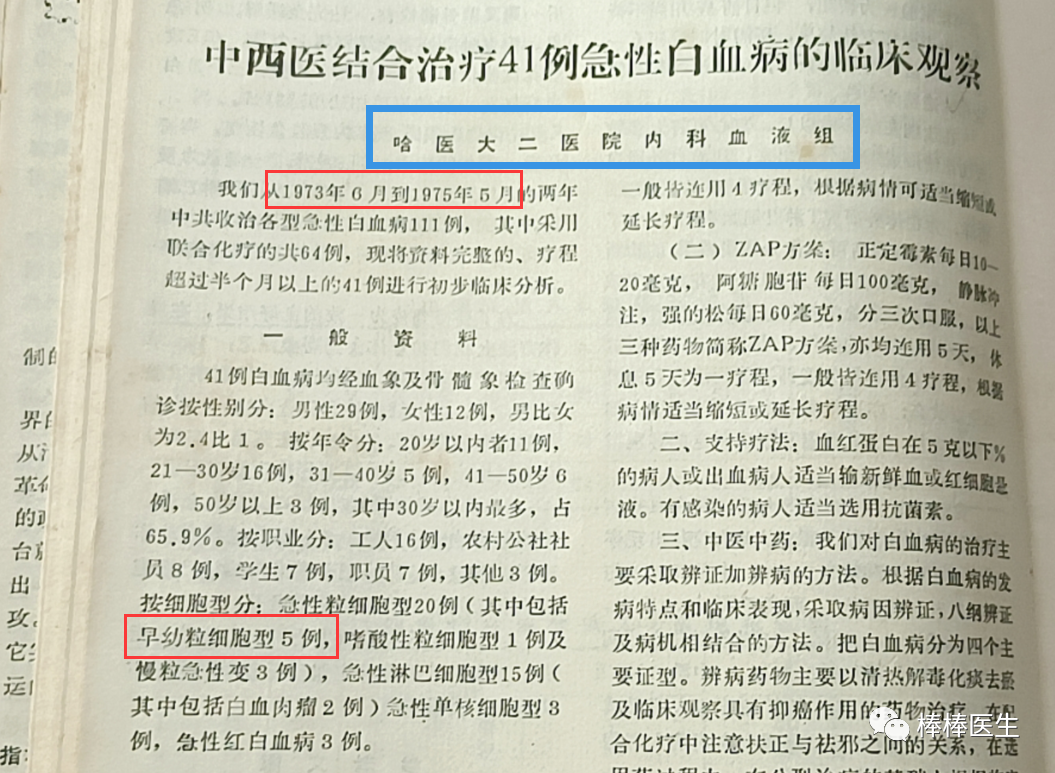 但是,我找到了有力的旁证,哈医二院内科血液组的《中西医结合治疗41例急性白血病的临床观察》。这篇文章表明,早在1973年,哈医二院就能够准确诊断急早粒(APL)、急单、急红,甚至急嗜酸粒等各亚型的急性非淋巴系白血病。二院能够,一院反而不能么?