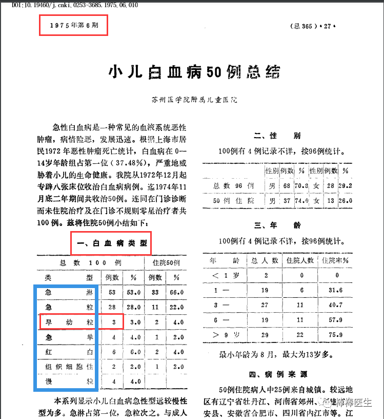 再找一篇其他地方的文章为证吧。苏州医学院儿童医院1975年发表的《儿童白血病50例总结》,报道的是1972年12月-1975年间的50例儿童白血病,非常精确地分为:急淋、急粒、早幼粒、急单、红白、组织细胞性、慢粒等各个亚型。