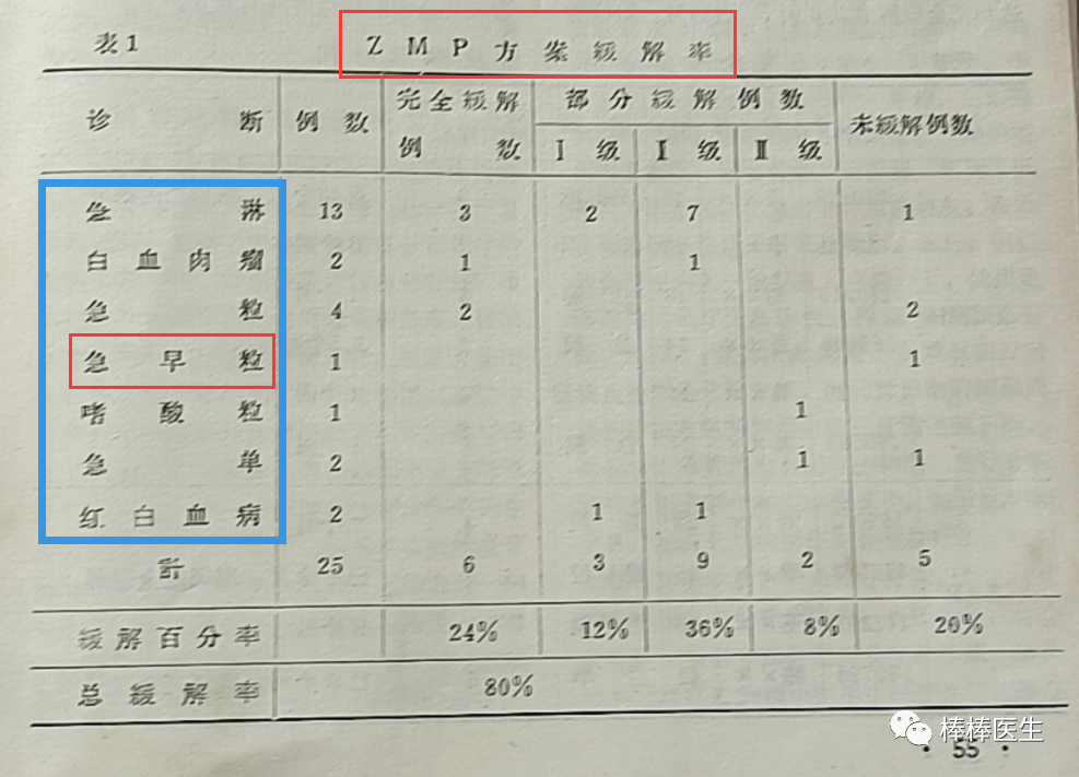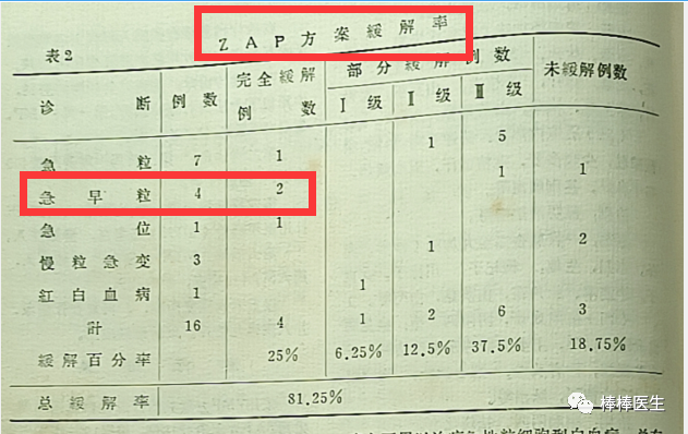 更为难得的是,二院血液组在讨论化疗疗效时,是把白血病亚型分开进行统计分析的,其中APL用ZAP的方案化疗完全缓解率高达50%,远远优于同期一院中医科癌灵一号+小剂量化疗对所有急粒的效果(1979年21.8%)。非常可惜的是,他们没有癌灵一号这个药,不然,很可能1975年就搞清楚了癌灵一号的真正疗效所在。