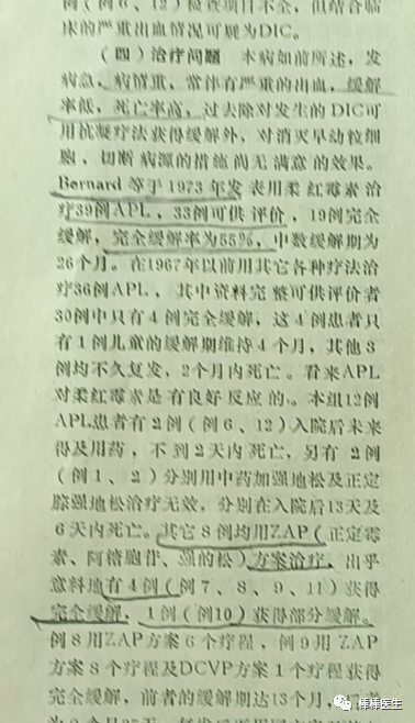 上回《商榷》中我已经给出了一篇文献,和张亭栋一个科室的哈医一院普内科主任关继仁在1981年的文章《急性早幼粒细胞白血病10例的临床观察及1例病理解剖的报告》报告了1978-1980收治的10例APL,化疗CR率达到50%。你尚可以说这是1981年写的文章,也许1978-1979年的病例是回顾性诊断的呢?
