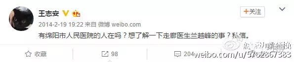 因为这期节目王志安目前还吃着官司呢,就是那个伪造了证据的官司。这又是一期典型的立场先行,罗织证据的节目,且看我的证据。王志安的《走廊医生》主要讲的是一位揭露过度医疗现象的医生兰越峰的故事。他在2014年2月19日发了这样一条微博,准备开始采访调查。