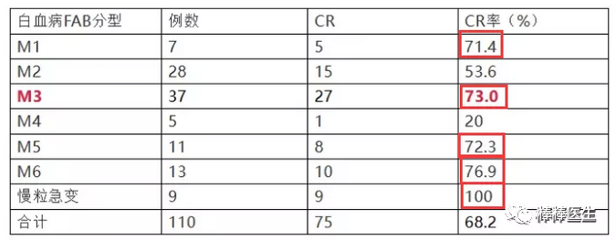 哈医一院大约从1971-1972年开始用癌灵一号(可视为三氧化二砷)治疗所有类型的白血病,直到1990年的过程中虽然发现个别病例(如检验科金镇敬医师首治,中医科续治的董某芝病例)系APL,效果特别好,但在总体上并没有发现对APL的特殊疗效,也没有真正开始单用三氧化二砷治疗APL及其他白血病。依据是1990年李元善、张亭栋的《AOAP方案治疗急性非淋巴细胞白血病110例临床观察》,证明中医科自1986年以来的110例急非淋,均用的是癌灵一号7天加上化疗的AOAP方案,结果显示其对慢粒急变、M6的效果最好,对M3(即APL)、M5、M1等疗效次之(如图)。足以证明其对M3既不是疗效最好,起效的也不仅是砷剂。