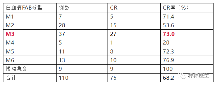 1990年的《AOAP方案治疗急性非淋巴细胞白血病110例临床观察》进一步证明他离不开化疗,他文中虽然莫名其妙说了一句对M3最好,但实际数据完全不支持,疗效最好的是慢粒急变和M6,M5和M1也不差。如图是我根据文章数据列的一个表: