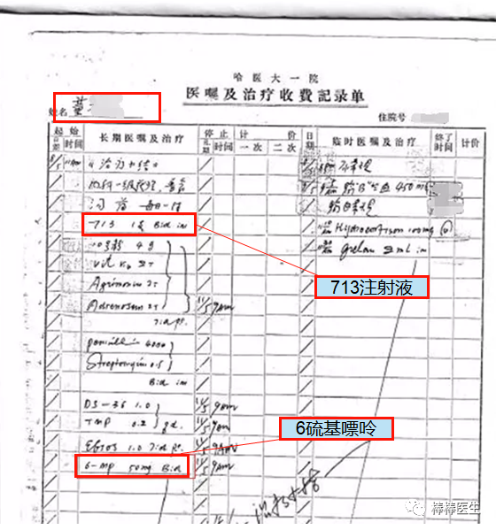 哈医大知情人给我提供了董某芝的原始病历医嘱单,证明确实是癌灵一号+化疗(6-硫基嘌呤)。如图: