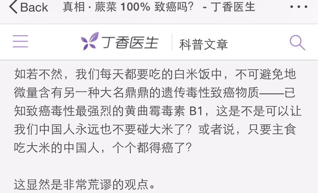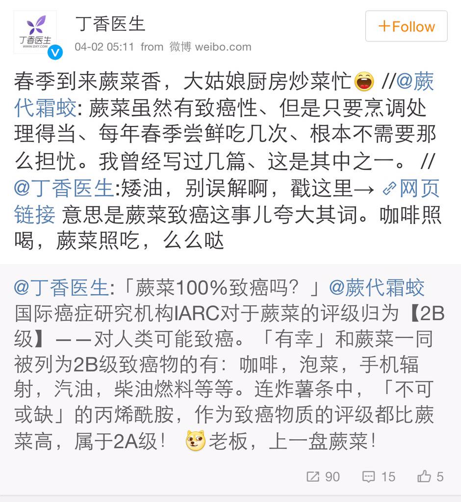 方舟子 @fangshimin · Apr 6丁香医生登绝代双骄的伪科普会害人的。国际癌症机构把蕨菜评为2B类致癌物是在1987年,以后没再重新评估。在那次评估中甚至把欧蕨苷评为可能不致癌(3类)。从那以后有更多证据表明蕨菜、欧蕨苷能致癌。绝代双骄拿过时材料洋洋得意,那不是害人吗 https://pbs.twimg.com/media/CB5shfPUEAAfLRO.jpg:large
