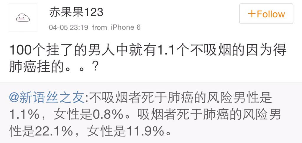 方舟子 @fangshimin · Apr 6理解错误,是100个不吸烟的男人中有1.1个死于肺癌,100个吸烟的男人中有22.1个死于肺癌。另外,这是85岁之前死于肺癌的风险。 https://pbs.twimg.com/media/CB5Q81iUkAEQtv5.jpg:large