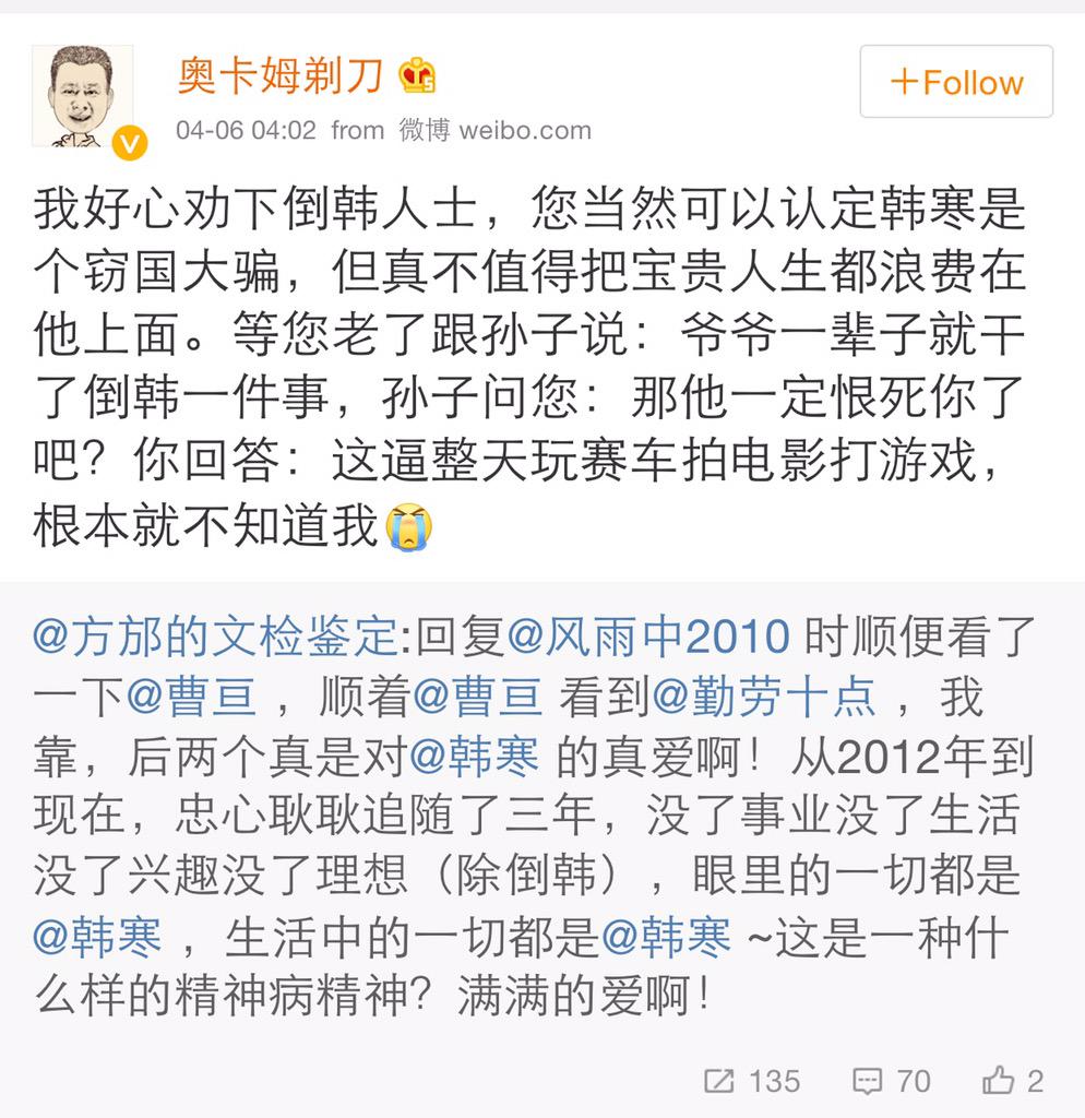 方舟子 @fangshimin · Apr 9打得骗子打一枪换个地方,只能做一锤子买卖,就够了。@StXh: 网易新闻也是韩寒代言,说是为了求真;现在听说韩寒还要搞一款游戏。打击力度还不够啊