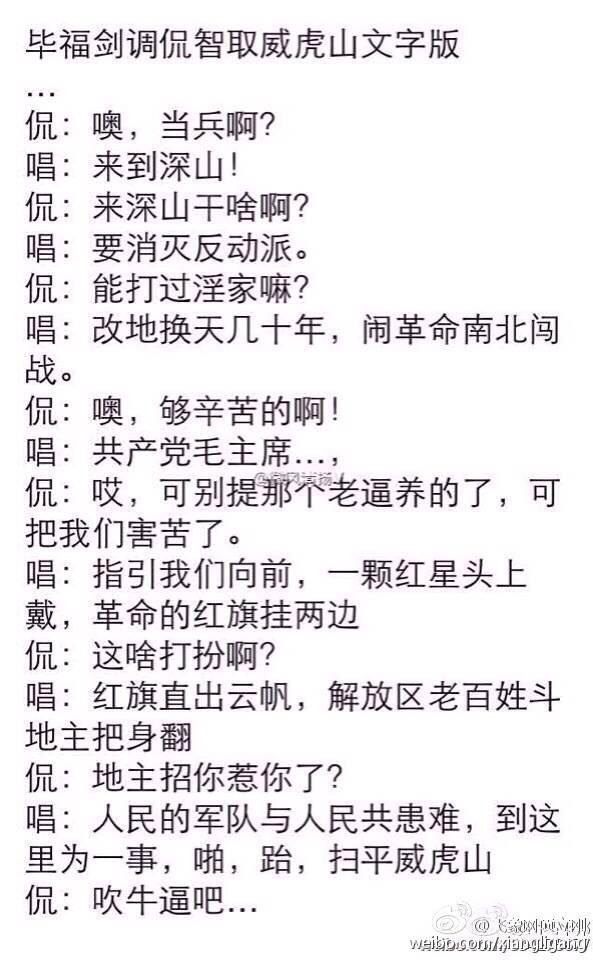 方舟子 @fangshimin · Apr 6毕福剑貌似是以戏中“不明真相”老乡的口气在做对白,犹如相声中的捧哏。如果是他的原创,倒是有逗乐天赋,不像崔永元只会背词。演反面角色无罪,不然演反派的演员都得抓起来。 https://pbs.twimg.com/media/CB9OOqPVEAAuirV.jpg:large