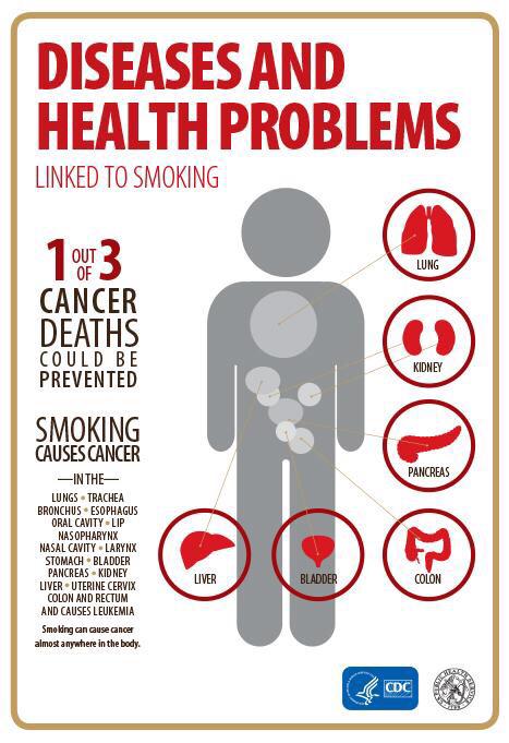 方舟子 @fangshimin · Apr 6美国疾控中心说,吸烟能在身体几乎所有部位引起癌症。三分之一的癌症死亡是吸烟导致的。 https://pbs.twimg.com/media/CB9db6rUsAA3Z5c.jpg:large