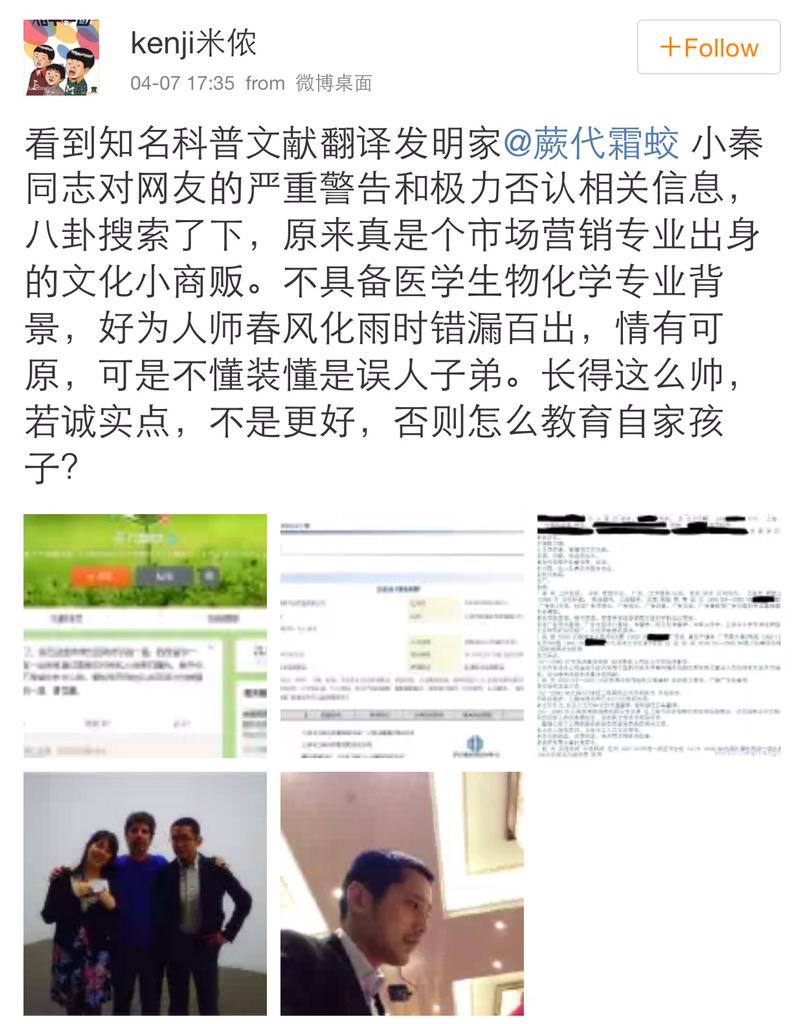 方舟子 @fangshimin · Apr 7为什么说“医学专家”蕨代霜娇就是上海大学广告系2002年本科毕业生秦硕论?秦在上海注册了一家文化营销公司叫树蕨文化;秦的照片与蕨发在微博上的照片相似;其求职简历自称从事日语英语翻译工作,与蕨自称翻译家重合;其在开心网发的帖子文字风格与蕨相同,而且都是用顿号代替逗号,一顿到底。