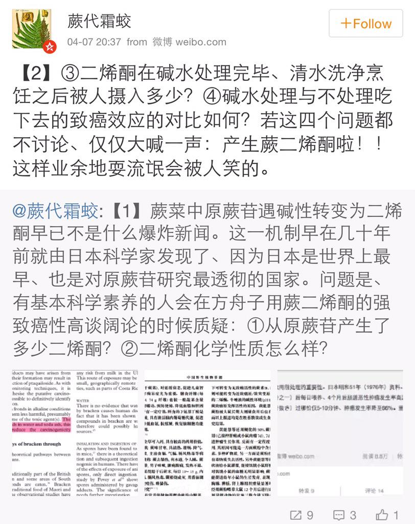 方舟子 @fangshimin · Apr 7蕨代双娇的伪科普最害人的地方,是介绍日本人用苏打水浸泡蕨菜,号称能去除蕨菜的毒性。事实上,蕨菜中的欧蕨苷在碱性环境下将分解成蕨二烯酮,而后者是比欧蕨苷强得多的致癌物。日本吃蕨菜的地区胃癌发病率高不是没原因的。这样的伪科普不是要害死人吗 https://pbs.twimg.com/media/CB-bKDnUAAENxqy.jpg:large