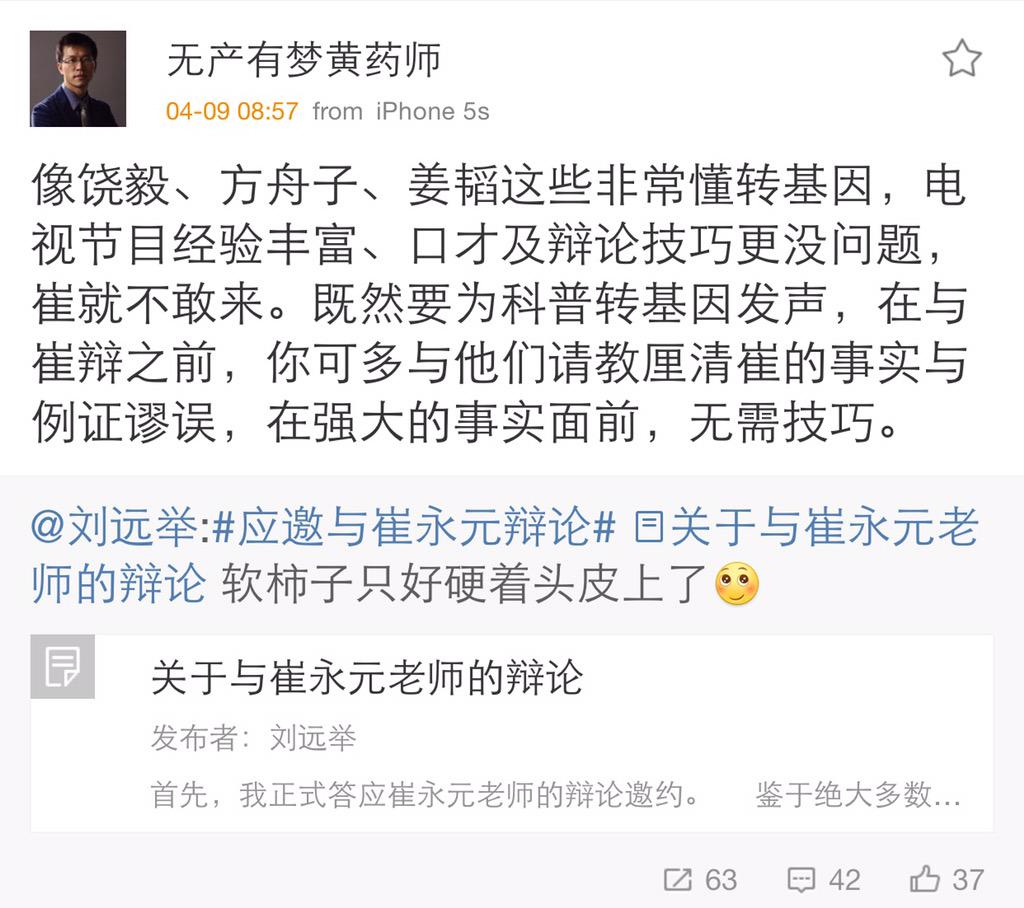 方舟子 @fangshimin · Apr 9崔永元挑一个写IT专栏的财经作家辩论转基因,真会找对手。其实一个合格的生物系学生要打败他绰绰有余了。 https://pbs.twimg.com/media/CCM02xKVIAEdle6.jpg:large