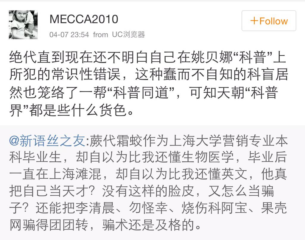 方舟子 @fangshimin · Apr 8我不认为一个上海大学市场营销专业的本科毕业生有资格来跟我辩论生物医学问题,去跟这种人比生物医学知识真是胜之不武。对蕨代霜蛟的揭露已经够彻底了,以后谁还愿意相信这个骗子的所谓医学科普的,好自为之。
