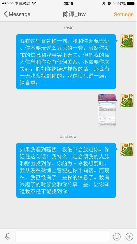 方舟子 @fangshimin · Apr 9蕨代霜蛟发私信恐吓网友。这是骗子的最后一招了。 https://pbs.twimg.com/media/CCMt2FJUAAA7KpC.jpg:large