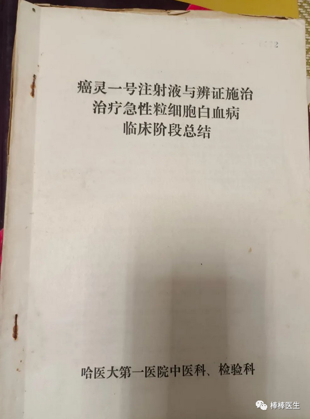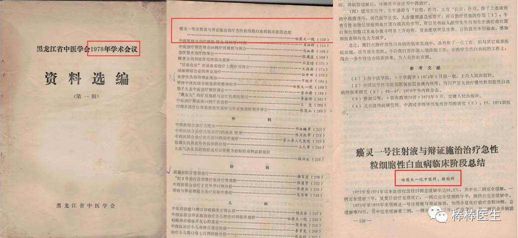 【证据一】1976年和1979年的季刊《哈医大学报(1-4)》合订本中有哈医二院内科血液组的一篇文章《中西医结合治疗41例急性白血病的临床观察》。这篇文章不仅证明早在1973年,哈医二院就能够准确诊断急早粒(APL);同时证明,哈医二院用ZAP方案化疗治疗急非淋总完全缓解率25%,治疗M3的完全缓解率50%,远优于一院用中医辨证+癌灵+小剂量化疗治疗急粒白的12/55=21.8%,治疗M3的未知(因为没有单独诊断出来)。