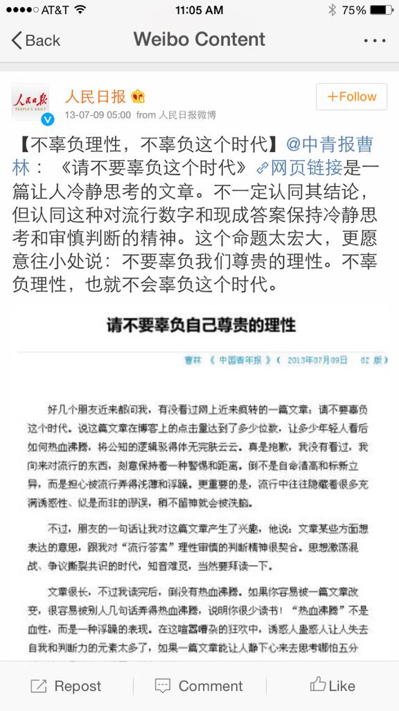 方舟子 @fangshimin · Nov 29中青报代言人曹林吹捧周梦游有冷静思考和审慎判断精神。这个人不是在努力当公知吗?两头押宝? https://pbs.twimg.com/media/B3qhbdUCEAAZsiU.jpg:large