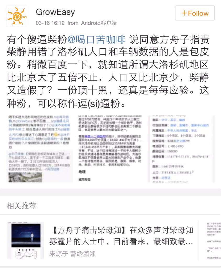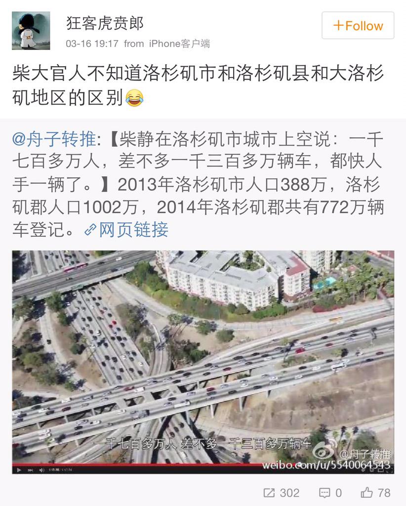 方舟子 @fangshimin · Mar 16那些用“大洛杉矶”来为柴静洗地的人完全对“大洛杉矶”没有概念。指洛杉矶郡倒也罢了(片中提到的圣塔莫妮卡在该郡),大洛杉矶包括五个郡呢。如果谈洛杉矶的问题用“大洛杉矶”的人口和车辆数据,就好比谈北京的问题时用京津冀的人口和车辆数据。 https://pbs.twimg.com/media/CARMHeMVIAAXRux.jpg:large