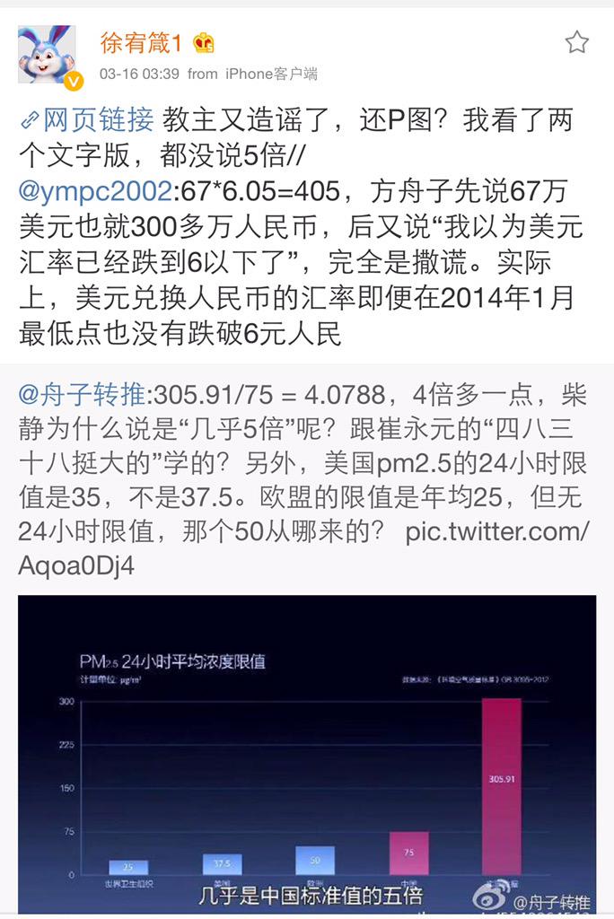 方舟子 @fangshimin · Mar 20我有根有据地揭露了柴静视频的错误、造假,徐宥箴则只会在那里哇哇破口大骂,看来崔永元“一日一肘子”的任务也要交给这个“懂管理的企业家”了。https://pbs.twimg.com/media/CAmNb9PUUAAX97N.jpg:large