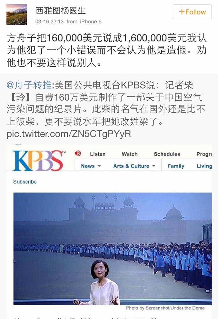 方舟子 @fangshimin · Mar 16美国公共电视台KPBS说:记者柴【玲】自费160万美元制作了一部关于中国空气污染问题的纪录片。此柴的名气在国外还是比不上彼柴,更不要说水军把她改姓梁了。 https://pbs.twimg.com/media/CARUCDCVAAEBsnk.jpg:large