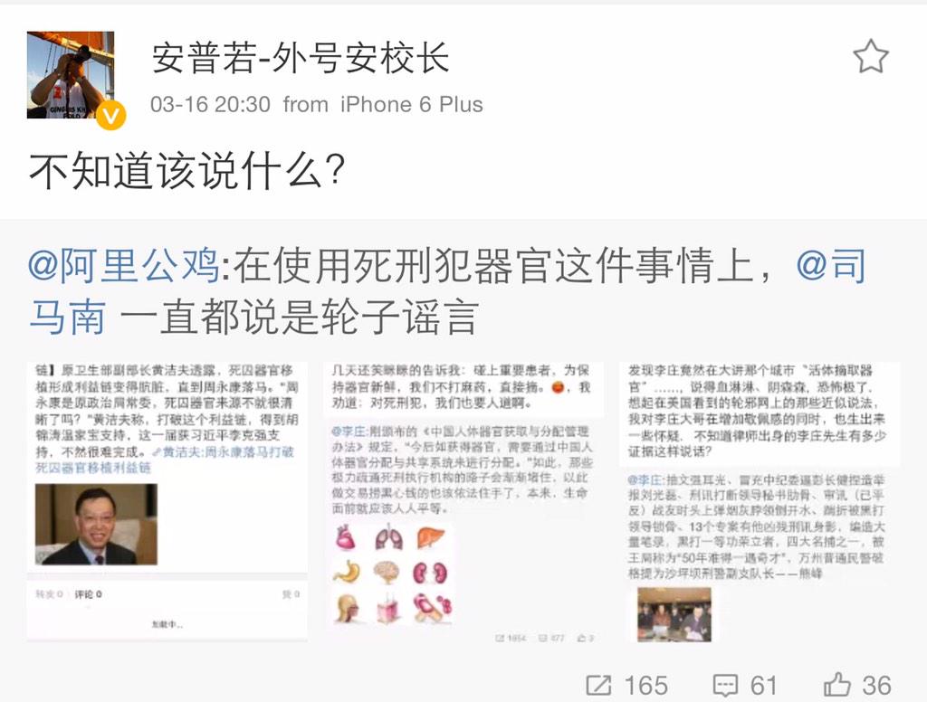 方舟子 @fangshimin · Mar 17看截图,司马南明明说的是轮子网摘造谣轮子被“活体摘取器官”,并不是否认死刑犯被摘取器官。 https://pbs.twimg.com/media/CASLBOBUcAAt_pG.jpg:large