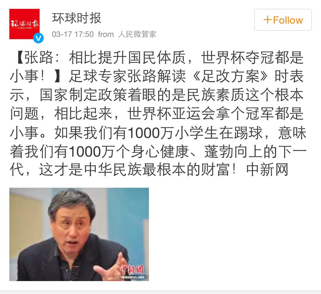 方舟子 @fangshimin · Mar 17【张路:如果我们有1000万小学生在踢球,意味着我们有1000万个身心健康、蓬勃向上的下一代,这才是中华民族最根本的财富!】这么说,南美的小学生是全世界身心最健康、最蓬勃向上的下一代。 https://pbs.twimg.com/media/CAWatKcU0AEEGuI.jpg:large