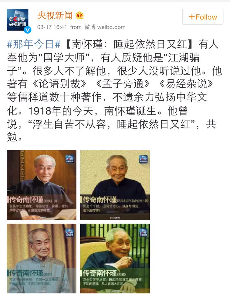 方舟子 @fangshimin · Mar 17央视、人民网都在纪念不学无术的江湖骗子南怀瑾,还要和他共勉呢。 https://pbs.twimg.com/media/CAWr-WYVIAA5_i2.jpg:large