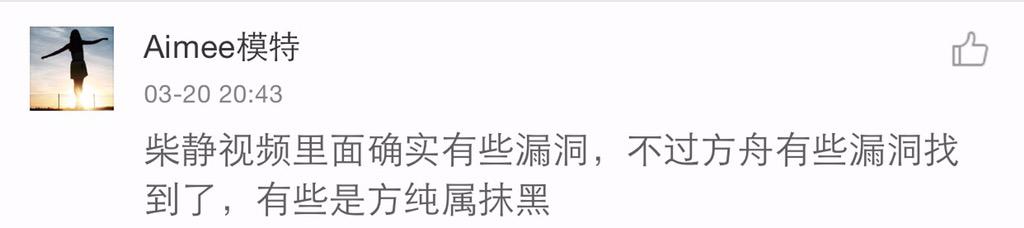 方舟子 @fangshimin · Mar 20这个到现在还跟徐宥箴打得火热的女方黑,为了在抹黑我时显得客观,竟敢承认柴静有漏洞被我抓住,当心哪天被土豪杀了吃人肉。 https://pbs.twimg.com/media/CAmT0F9VIAAQl73.jpg:large