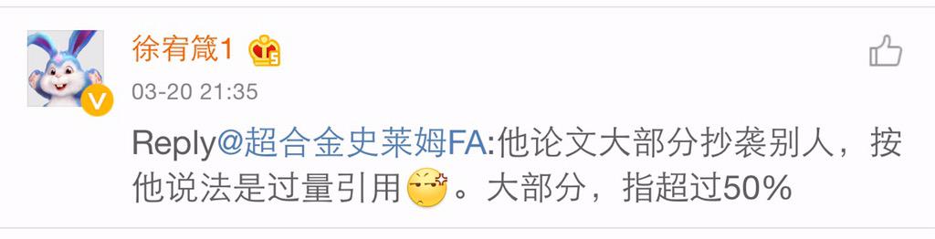 方舟子 @fangshimin · Mar 20徐宥箴要打我的博士论文的假,说我的论文百分之五十以上是抄的。亦明奋斗了十几年的未竟大业,看来要由这个只有初中文化程度、英文一句不懂、中文也经常看不懂、极度不学无术的土豪完成了。其他所有被称为土豪的人跟此人相比,简直得算得上是贵族。 https://pbs.twimg.com/media/CAmYUC1UkAA74Av.jpg:large
