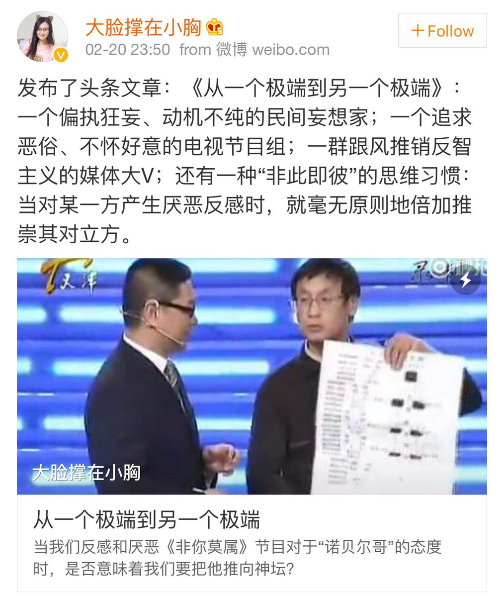 方舟子 ?@fangshimin Feb 22 最无耻的是这种横扫一切的道德高人。她说那期节目只是一门心思在奚落和嘲笑,没有提供任何有价值的信息。我在节目中说如果认为自己做出重大科学发现,应遵循科学规范写论文发表,在她看来这也是奚落和嘲笑?有几个嘉宾力挺诺贝尔哥,也是奚落和嘲笑? https://pbs.twimg.com/media/Cbz9Ro3UsAAf78J.jpg