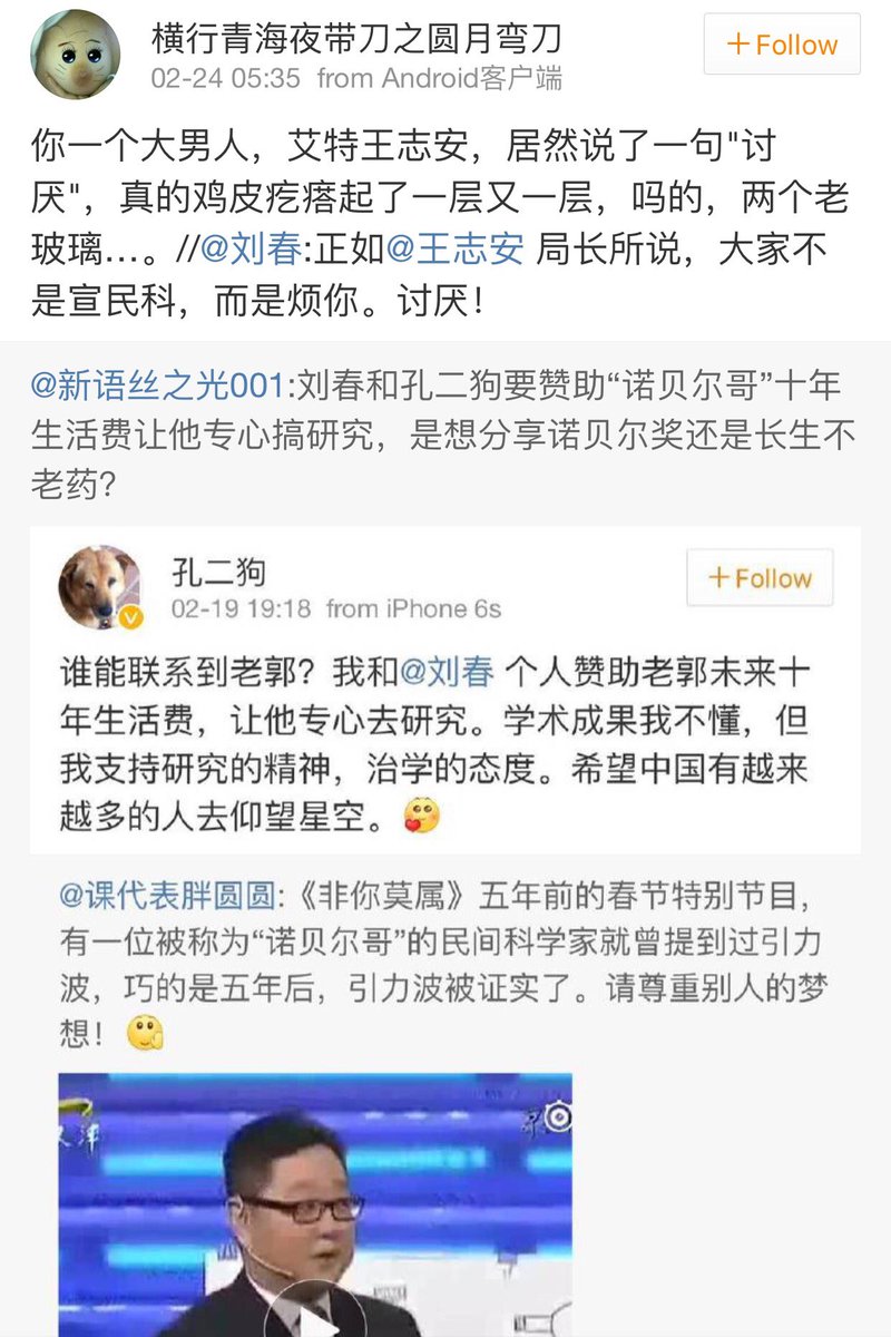 方舟子 ?@fangshimin Feb 23 刘春和孔二狗要赞助“诺贝尔哥”十年生活费让他专心搞研究,是想分享诺贝尔奖还是长生不老药? https://pbs.twimg.com/media/Cb8eD-fUMAEA4KG.jpg