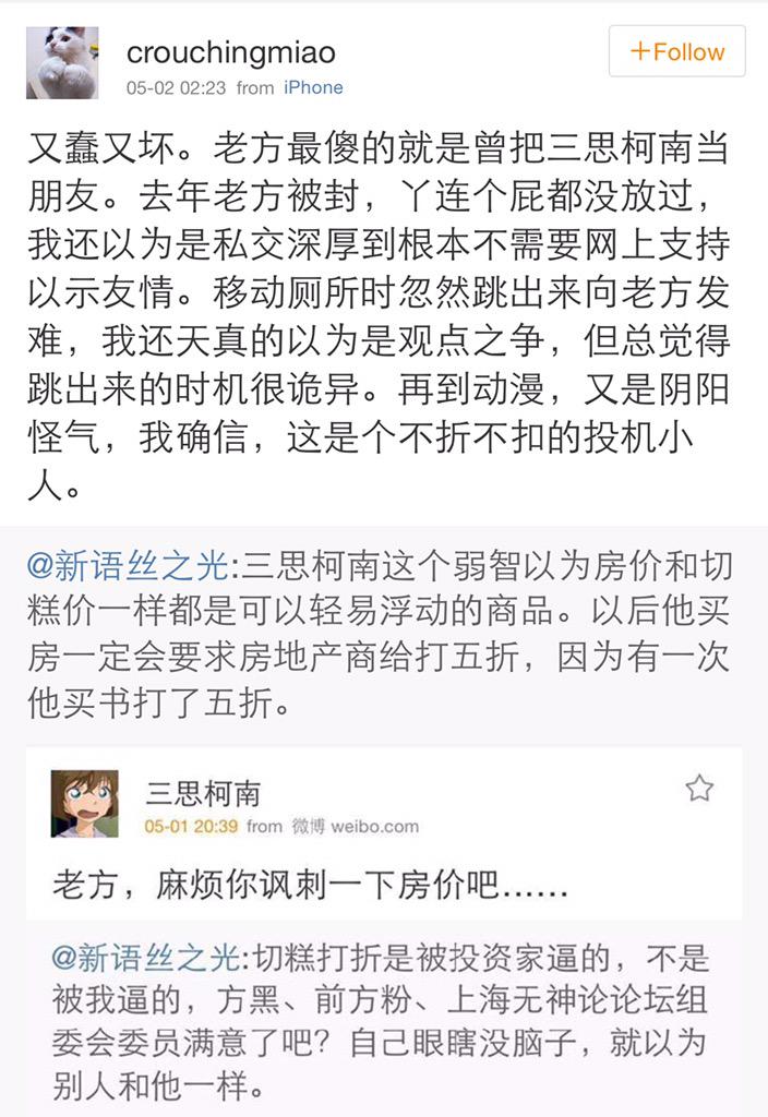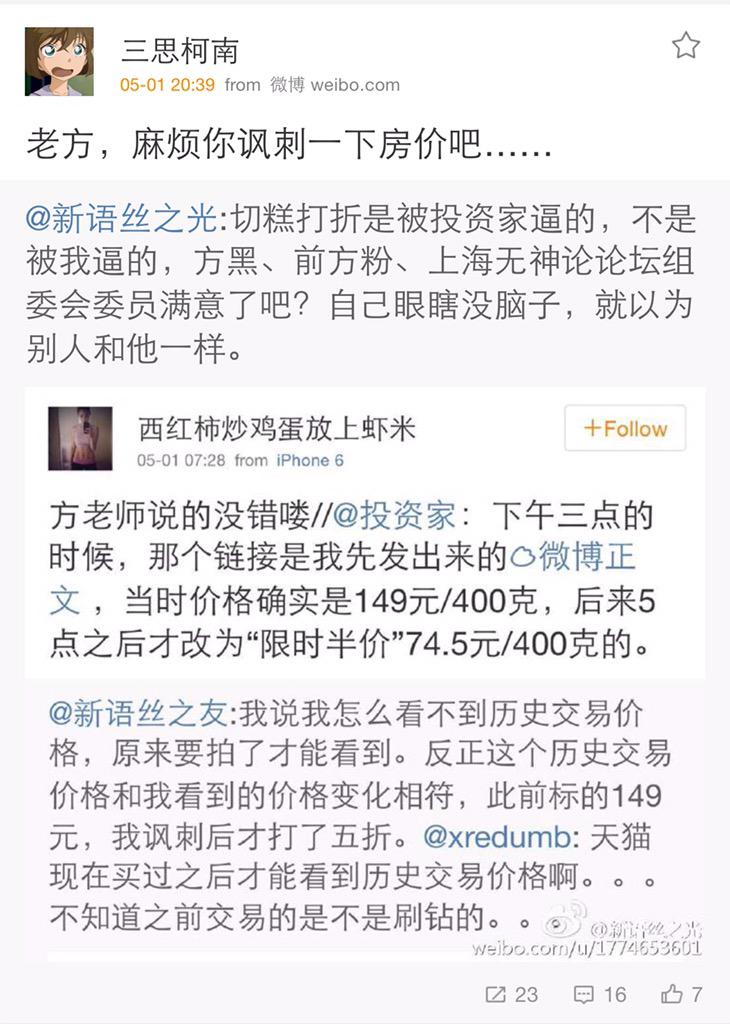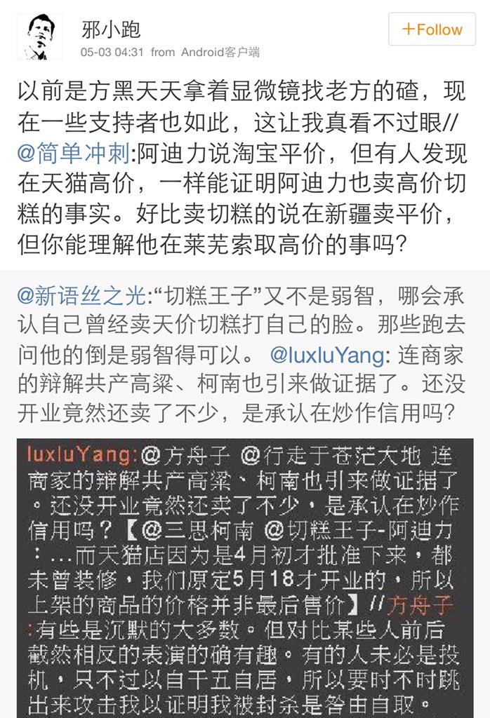 方舟子 @fangshimin · May 3三思柯南、共产高粱在切糕定价问题上满地打滚,是为了说明我被管管封杀后网上影响力降为零,不是我发条微博就能让360如临大敌、让一汽解雇秦火火的时候了,他们也就可以心安理得地当方黑。我早就说过“切糕王子”降价应归功于比我更早注意到这个问题的投资家,他们还在打滚,只是为了证明智商之低了