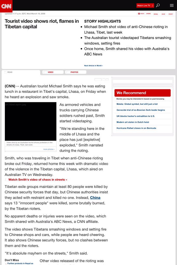 方舟子 @fangshimin · May 1自干五说虽然纽约时报报道西藏暴乱,但CNN报道是“和平示威”。那我们就来看看CNN对三一四暴乱的报道:“旅游者视频显示西藏首府发生暴乱和起火”。自干五的脑子是特殊材料做的。 https://pbs.twimg.com/media/CD-c2gxVAAAWws1.jpg:large