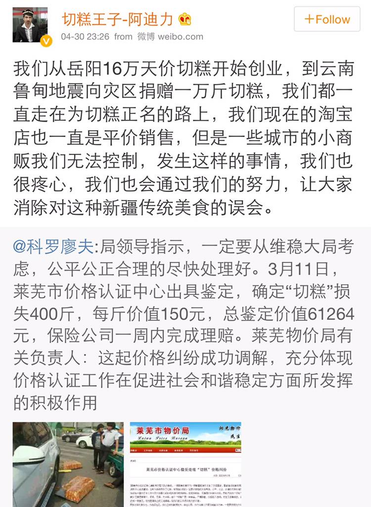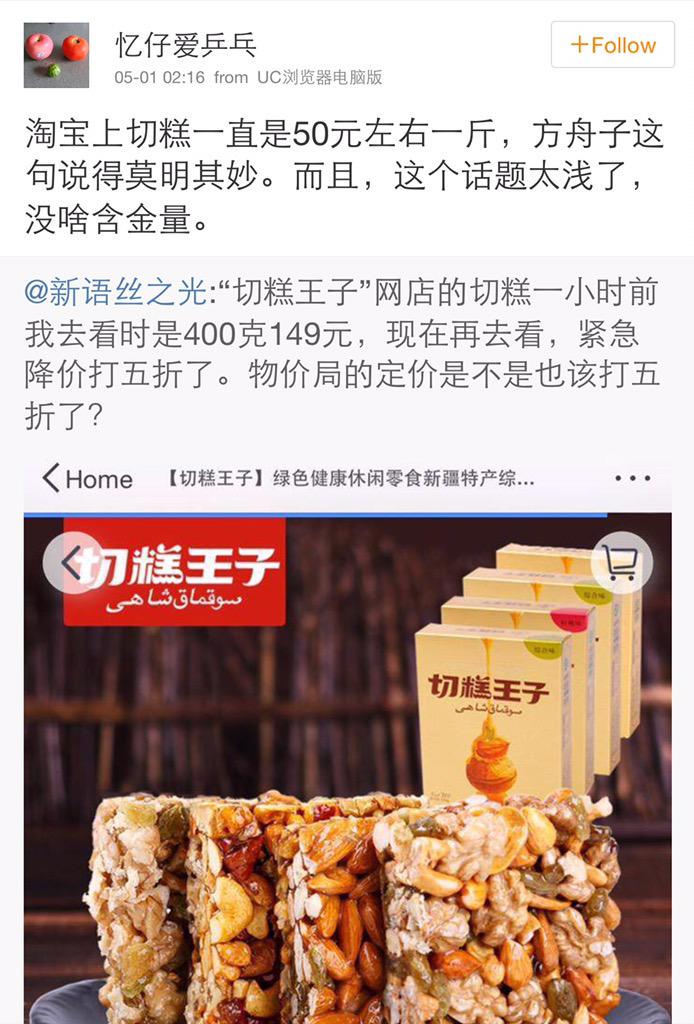 方舟子 @fangshimin · May 2事情经过是这样的:物价局定了切糕赔偿价每斤150元,“切糕王子”跟贴声称自己卖平价切糕、为切糕让人误解痛心,投资家和我先后发现切糕王子旗舰店切糕400克卖149元。一个小时后该切糕打五折。忆仔、柯南、高粱等人声称切糕王子一直就只卖50元,多人证明其刚刚降价后,又改口声称降价是巧合