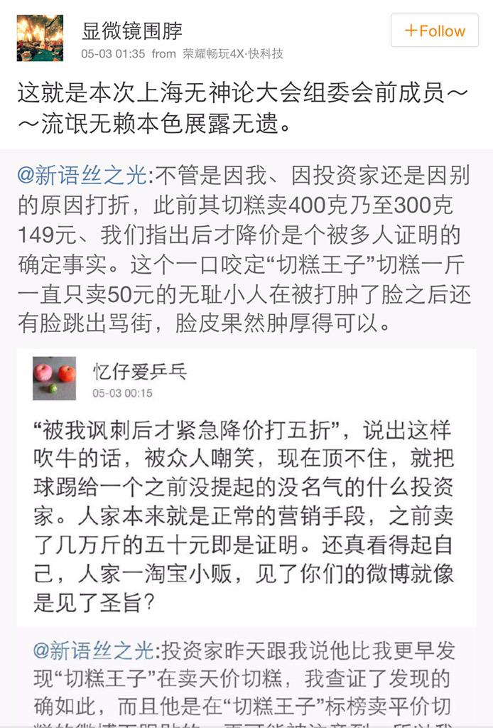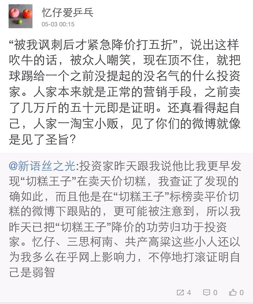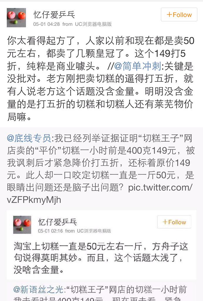 方舟子 @fangshimin · May 3投资家昨天跟我说他比我更早发现“切糕王子”在卖天价切糕,我查证了发现的确如此,而且他是在“切糕王子”标榜卖平价切糕的微博下跟贴的,更可能被注意到,所以我昨天已把“切糕王子”降价的功劳归功于投资家。忆仔、三思柯南、共产高粱这些小人还以为我多么在乎网上影响力,不停地打滚证明自己是弱智