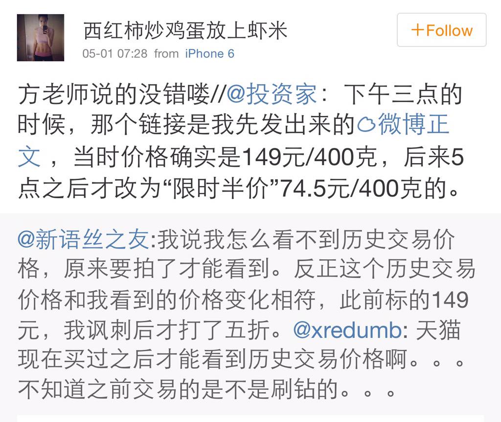 方舟子 @fangshimin · May 1我说我怎么看不到历史交易价格,原来要拍了才能看到。反正这个历史交易价格和我看到的价格变化相符,此前标的149元,我讽刺后才打了五折。@xredumb: 天猫现在买过之后才能看到历史交易价格啊。。。不知道之前交易的是不是刷钻的。。。