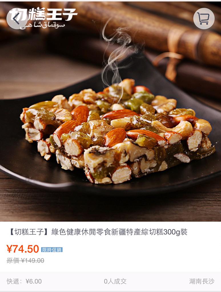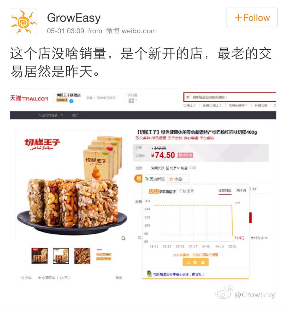 方舟子 @fangshimin · May 1“切糕王子”网店的切糕一小时前我去看时是400克149元,现在再去看,紧急降价打五折了。物价局的定价是不是也该打五折了? https://pbs.twimg.com/media/CD6KvUoVAAAt0Hn.jpg:large