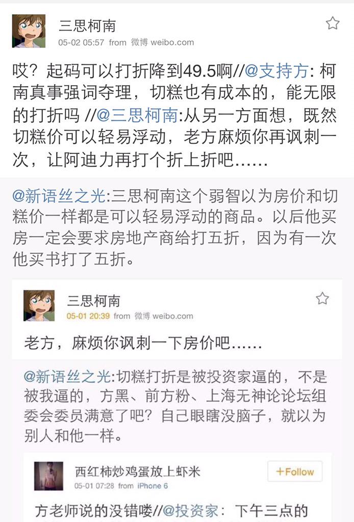 方舟子 @fangshimin · May 1三思柯南这个弱智以为房价和切糕价一样都是可以轻易浮动的商品。以后他买房一定会要求房地产商给打五折,因为有一次他买书打了五折。 https://pbs.twimg.com/media/CD-XjI4UIAAGMo1.jpg:large
