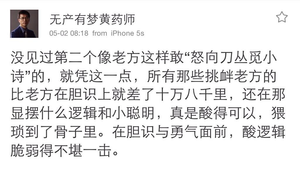 方舟子 @fangshimin · May 2老方敢“怒向刀丛觅小诗”,他们就敢“怒向老方觅小诗”,胆识比老方高嘛。 https://pbs.twimg.com/media/CEDTaD3UMAAnmO4.jpg:large
